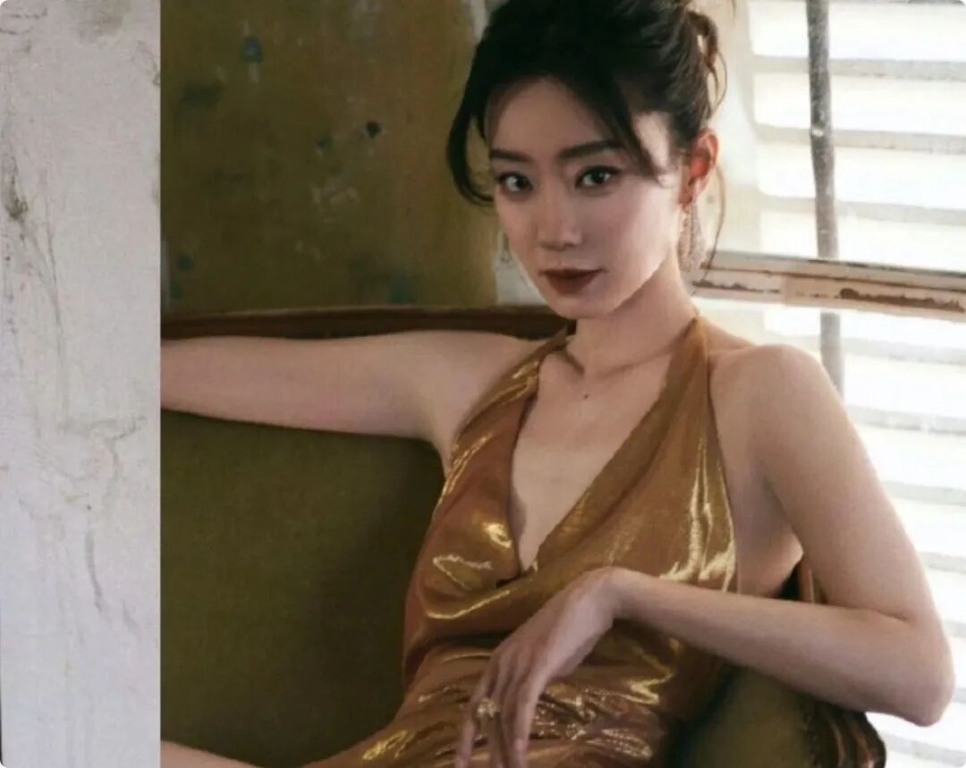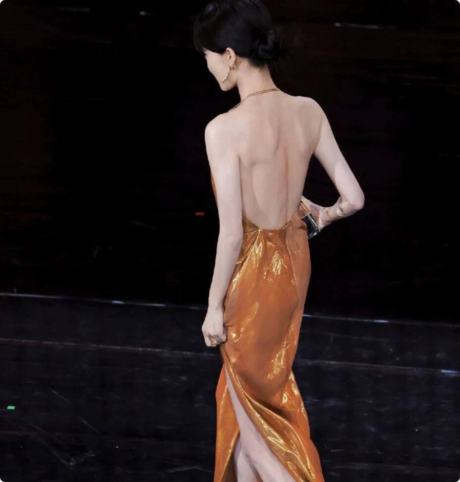 照片里,张小斐身穿的这件深v礼裙,版型柔软,挂脖式的设计,中和了金色自带的攻击性,腰部的褶皱以及随着张小斐轻微走动时贴合身材的柔软布料,都在突出张小斐身上的亲和力。