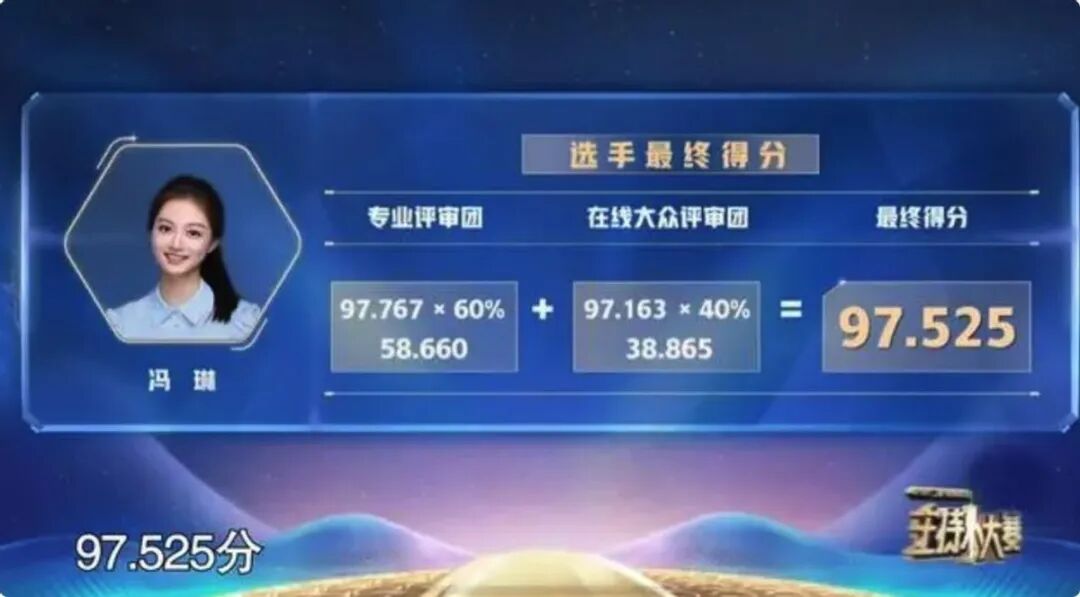 也正是因为如此,冯琳拿到了专业评审和大众评审都突破97的平均分成绩,成为了这一场的冠军。