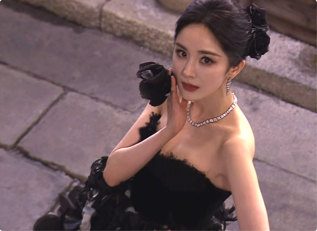 同样是90花,李沁选择的这套礼服设计更加复杂,但说实话,李沁从长相到气质都是小白花的类型,这套黑色的网纱感裙子和她不搭。