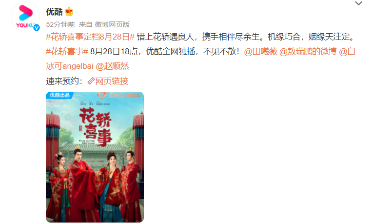 据悉,新《上错花轿》(改名《花轿喜事》),已经定档8月28日上线独播。