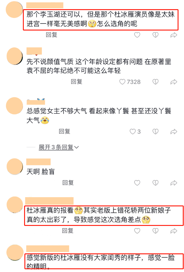 难怪网友看完预告之后,就彻底萎了,纷纷吐槽“杜冰雁演员像是太妹进宫一样毫无美感”、“杜冰雁没有大家闺秀的样子,感觉一脸精明”。