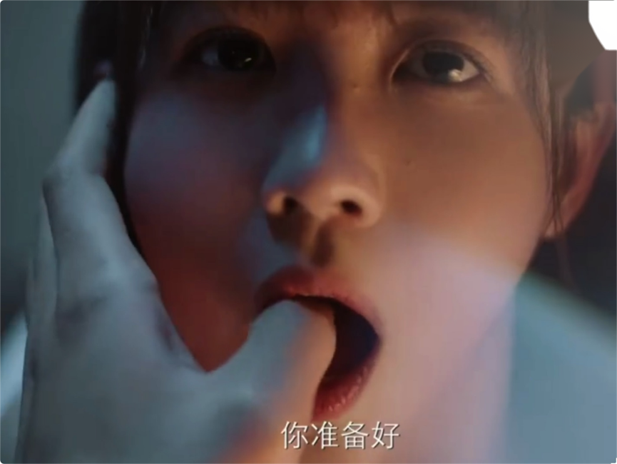 是赖美云饰演的女主微微张嘴,男演员将大拇指伸入女主口中。