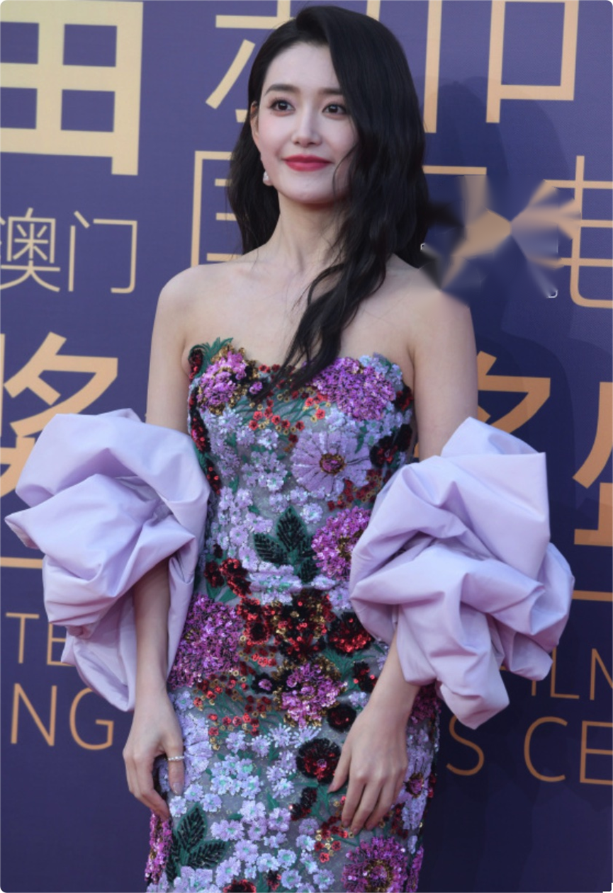 00后女演员蒋依依选择了一条彩色的花卉长裙,刺绣的设计无比重工,紫色系的色块在她身上绽放出一朵又一朵的花朵。