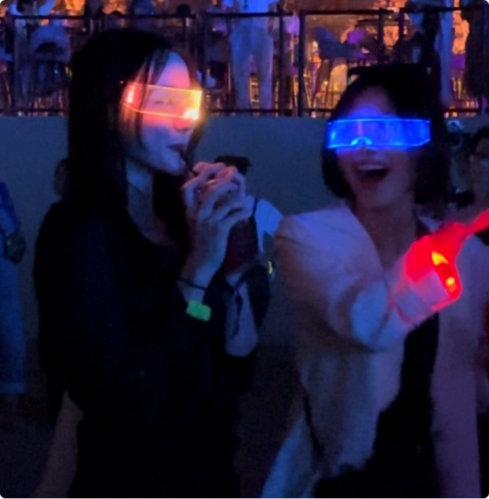 两人听到音乐就开始尬舞,动作整齐划一,神情相当沉浸。