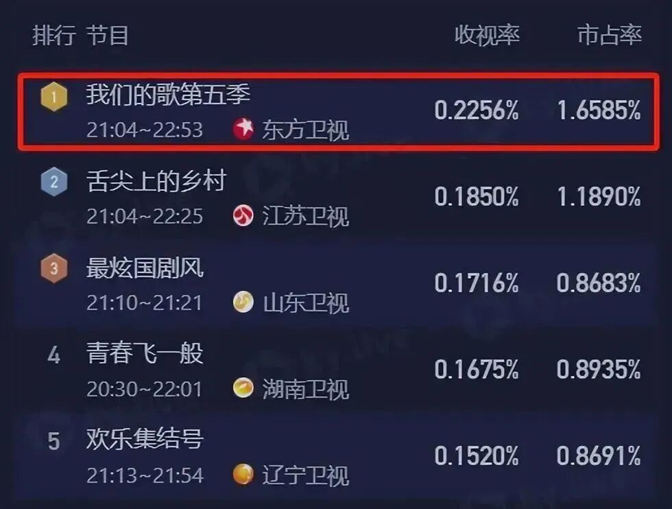 根据数据显示,综艺《我们的歌第五季》开播一天,就拿下了卫视黄金档的收视冠军。