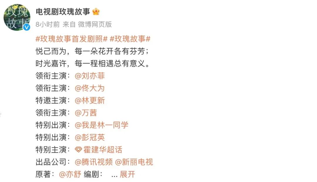 9月5日,电视剧《玫瑰故事》的官方账号发布了一条官宣阵容的动态。