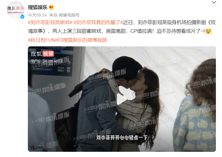 在视频里,彭冠英和刘亦菲现身机场,刘亦菲小跑拥吻。