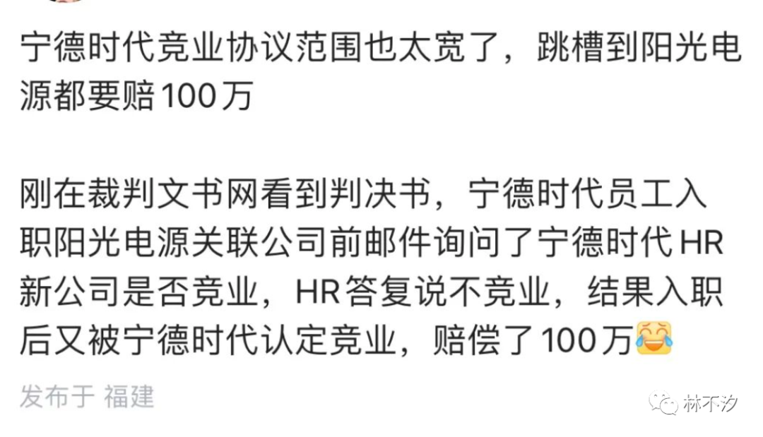 竞业赔偿的威胁导致员工跳槽同行业的概率降至冰点。在机会如此单一化的环境下,宁德时代的996已成为令人咋舌的常态。