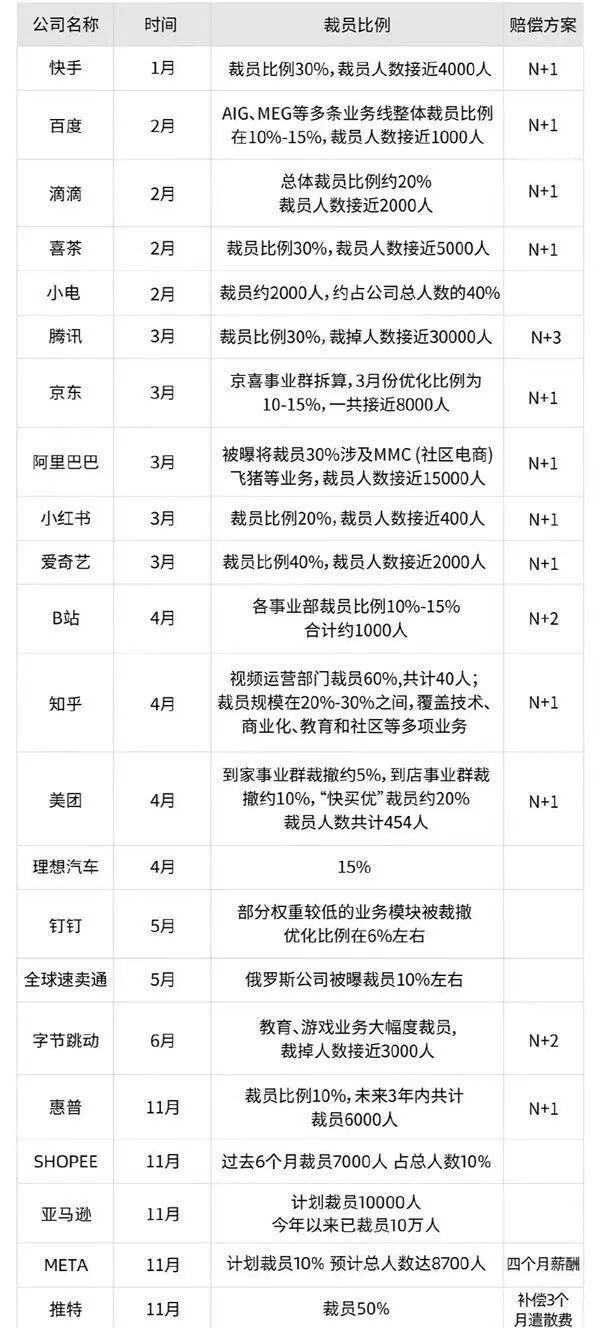 来看看今年截至11月,各个大厂的裁员情况。据统计,今年这些大厂约裁员超过20万人,其中有部分甚至没有给到N+1,对整个就业市场的冲击可谓是重量级的。