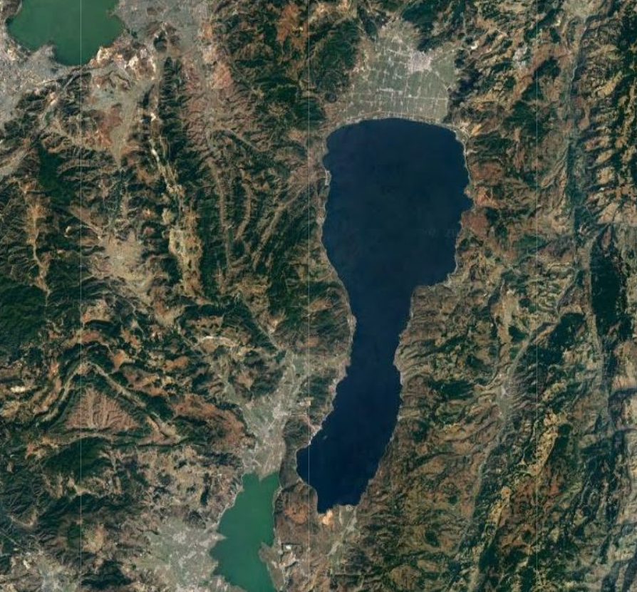 ▲我国不但缺乏大湖,还缺深湖。储水量最多湖泊是云南抚仙湖,面积216.6Km²,平均水深95.2米,蓄水量206.2亿m³(云南旅游文化厅网站数据),深水湖的颜色卫星图一目了然。