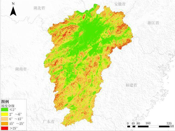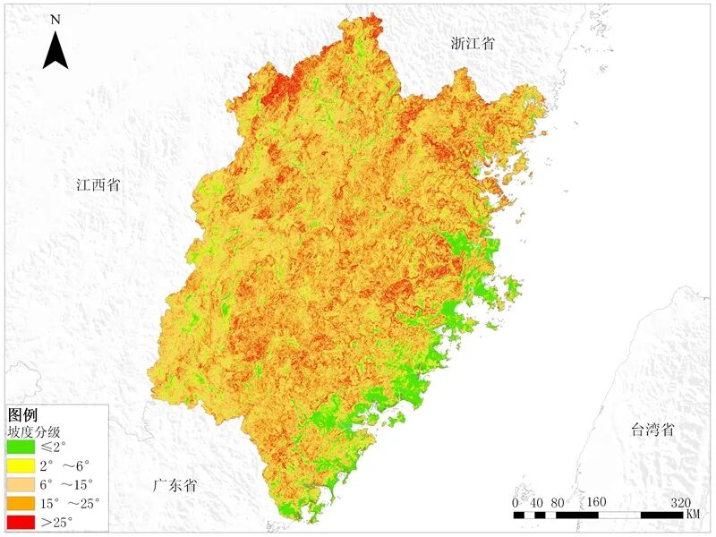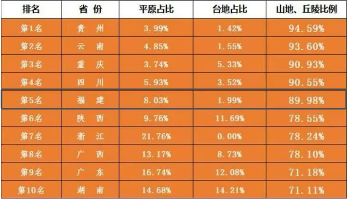 ▲福建省坡度地图,只有沿海漳州、厦门、泉州和福州有几块平地,和隔壁江西省对比都很鲜明。实际上福建地不平的情况,比下表的数据更夸张,因为很多省份的丘陵也平缓一些。