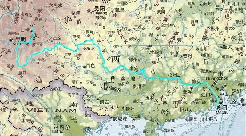 西江是平时说“珠江”主要指代的河流,发源于云南省曲靖市沾益区境内的马雄山(属于著名的乌蒙山脉),流经云南、贵州、广西、湖南、广东5个省份,在珠海市的磨刀门水道注入南海。干流河段有很多名字:南盘江-红水河-黔江-浔江-西江。