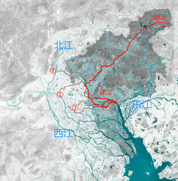 ①西南涌、②芦苞涌,还有③佛山境内有一些水道,从北江出来流入珠江。河流水道在平原偶有交叉是很常见的,不能因此说北江变成珠江的一部分了,北江入海主干非常明显,根本不会弄混淆。河口西南涌和芦苞涌是水闸控制的分洪水道。随便搜一条新闻:两个闸门雨季加大分洪,减轻北江洪水压力:↓