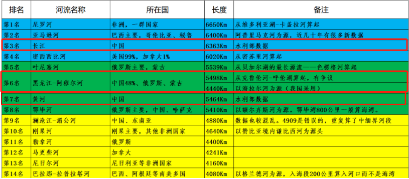 黑龙江-阿穆尔河,是一条世界级大河,网上讨论也比较热门。它是世界第6、亚洲第3长河(仅次于长江、叶尼塞河),东亚第2大河(仅次于长江),东北亚地区第1大河。特别是它的账面流域面积达185.6万Km²,比长江还略大一点(我觉得值得商榷),很多网友据此说黑龙江比长江还大。从水量看,黑龙江年均径流量3400多亿m³,比黄河则大了五倍!