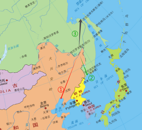 中策,沿着乌苏里江倒流,从符拉迪沃斯托克(海生崴)注入日本海(箭头②),价值虽然不如上策,也还不错,离经济热门地区日本、韩国近很多。