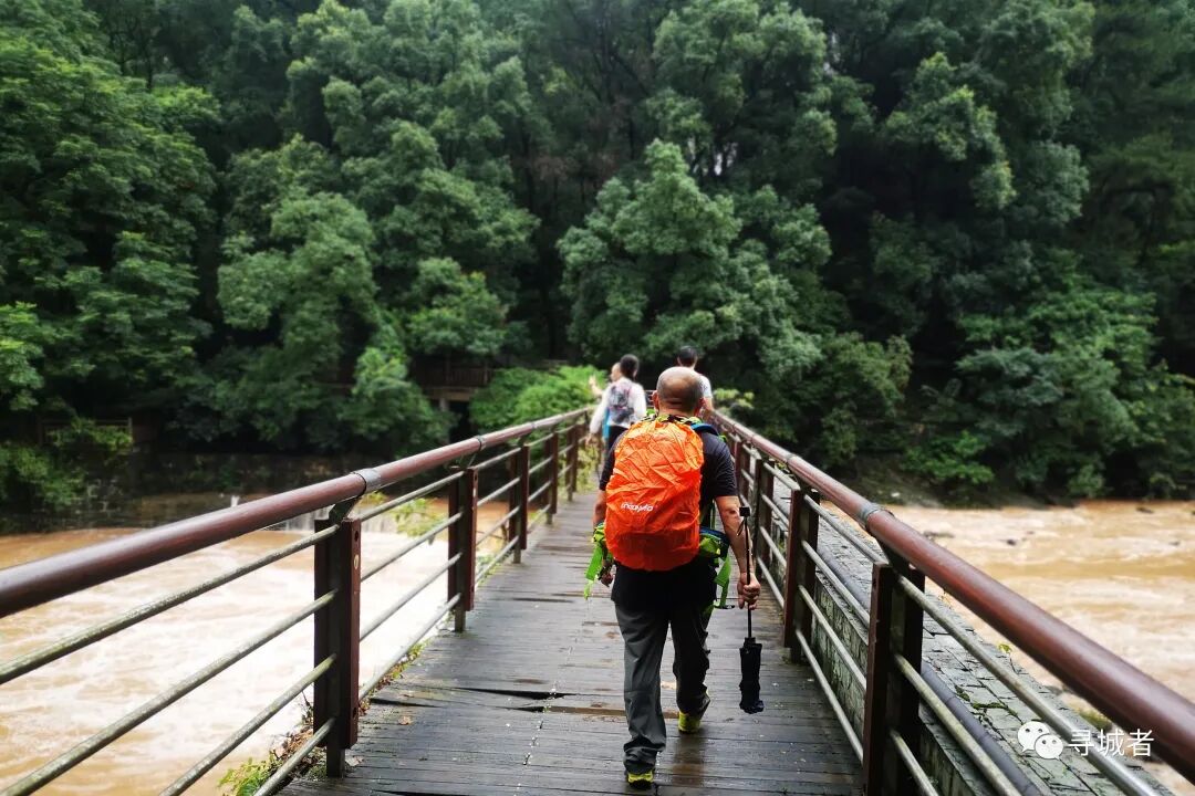 穿过河上的现代桥梁溯溪而上,昨日的暴雨让花溪河水暴涨,湍急浑浊的河水飞泄而下,激流冲刷着两岸的岩石,河边的步道因人迹罕至和近期充沛的雨水变得湿滑不已。
