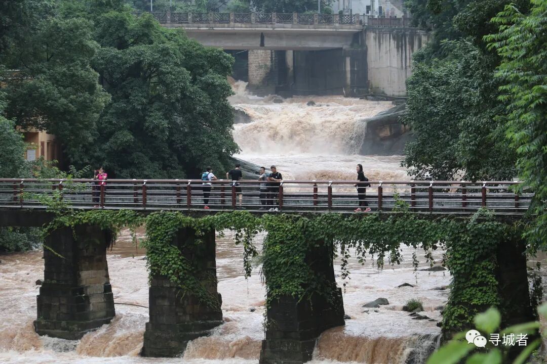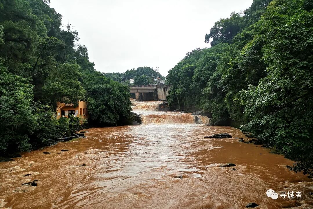 近些时日的大暴雨,让花溪河水暴涨,两岸云雾缭绕,河水泄入层层石梁深谷,形成众多梯级瀑布,惊起阵阵水雾,气势惊人,景色颇为壮丽。