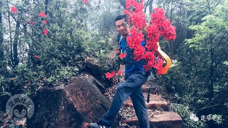 行走在山脊中间的小道,两旁是翠绿的森林和含苞待放的杜鹃。