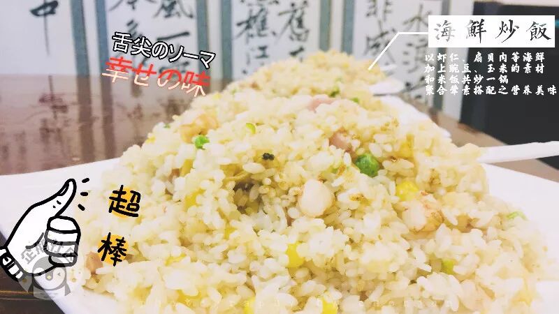 特推菜品之————海鲜炒饭:兼顾虾肉、扇贝等海鲜的鲜香,豌豆、玉米等蔬菜的清香,再加上大米饭的米香,这样一盘简单却营养丰富的美味,在工作的匆忙之余,恐怕是最普通却又最美味的家常味道。