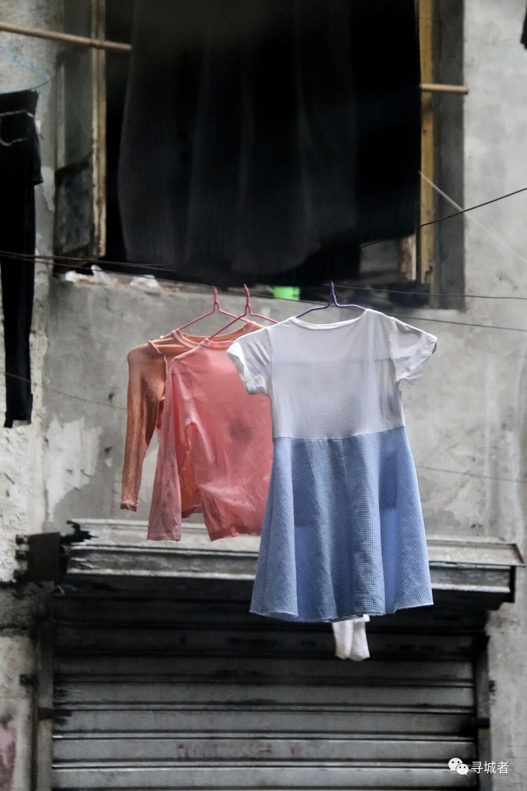 晾衣绳上挂着洗涤暴晒的衣服