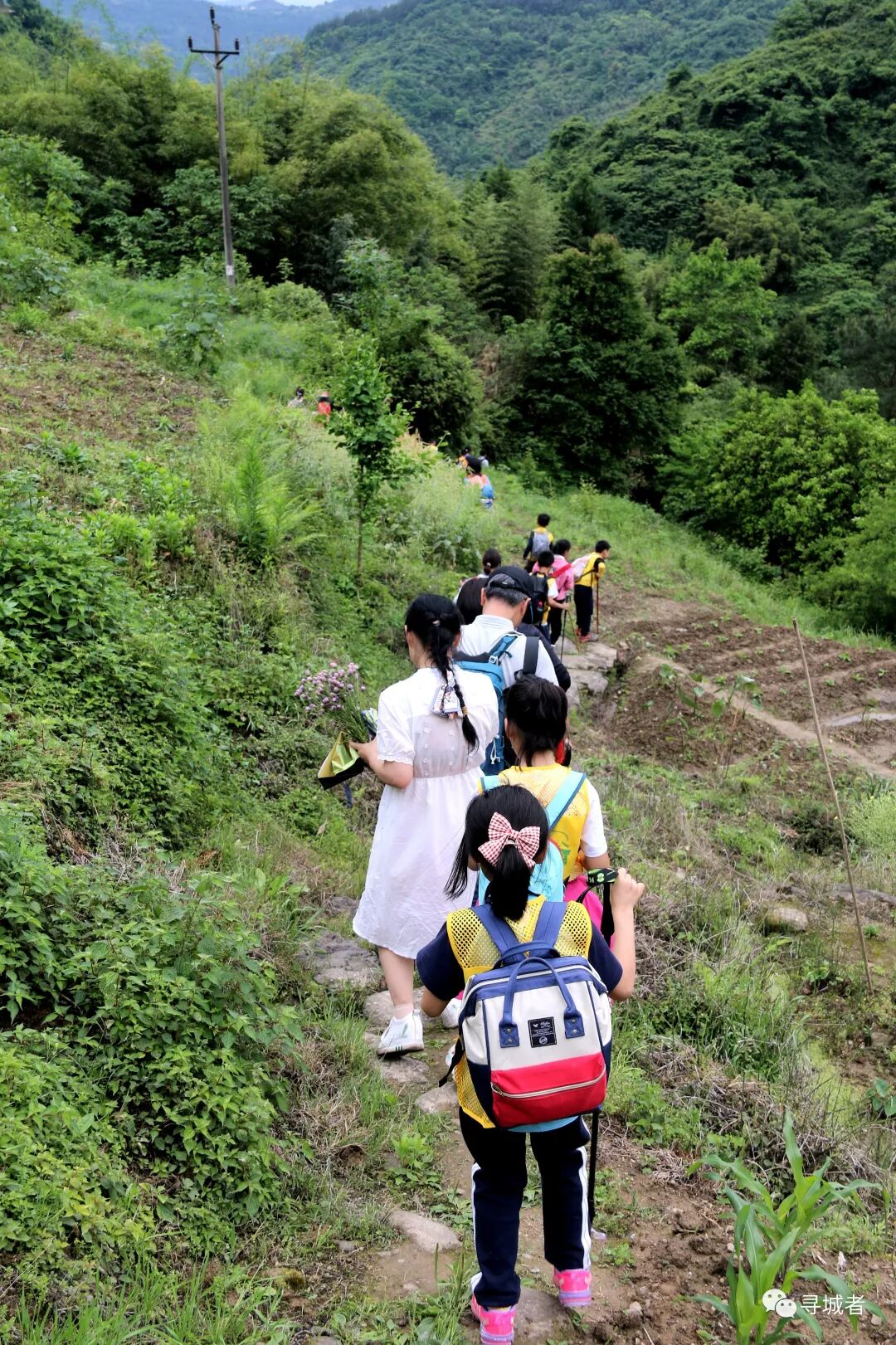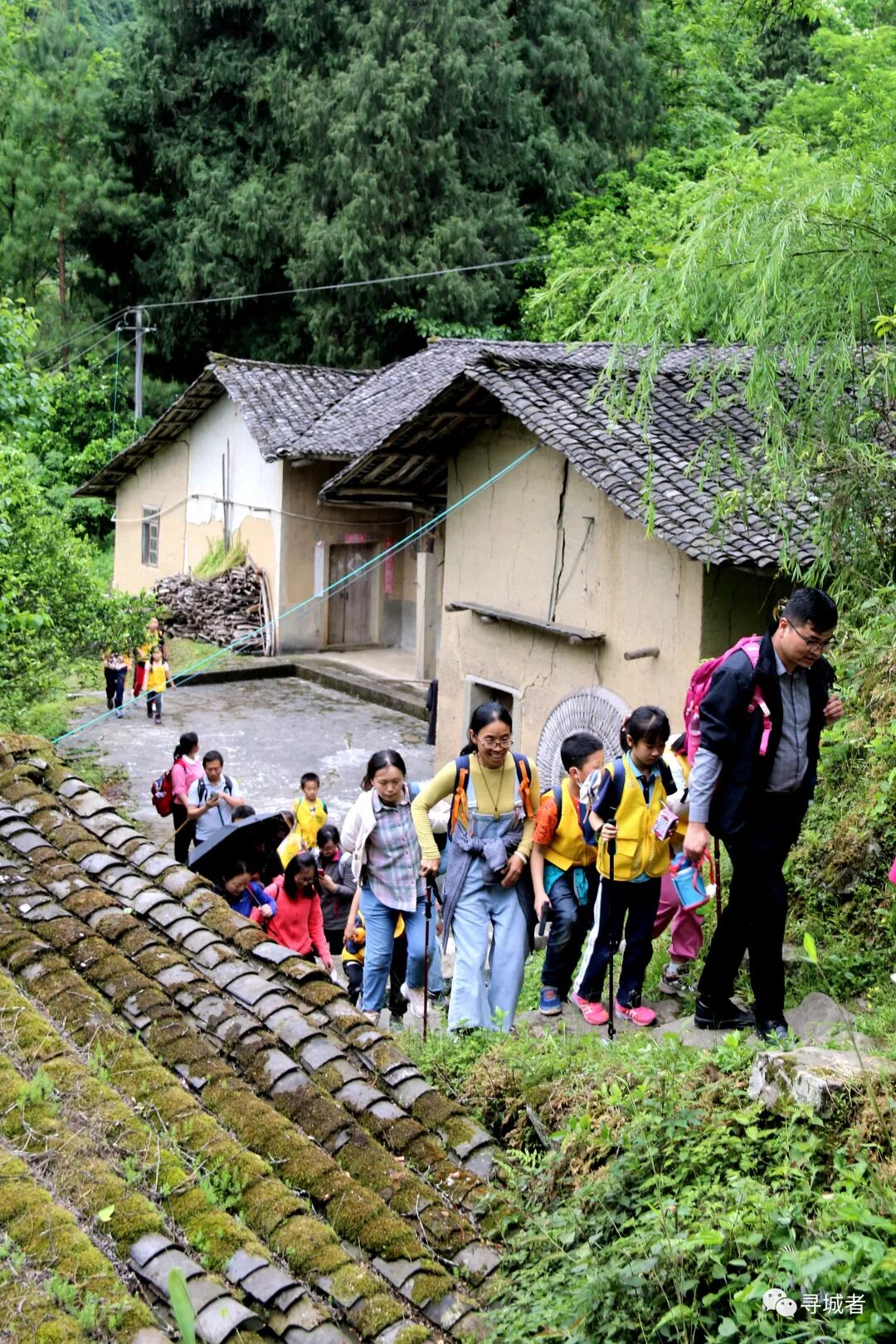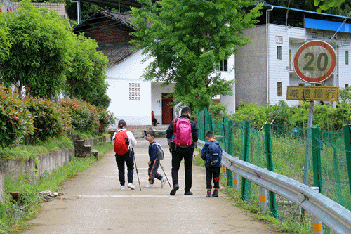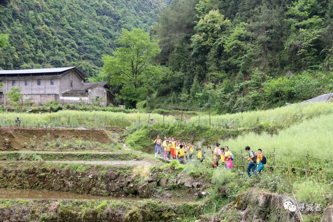 一群研学的小朋友跑过垭口的老房子