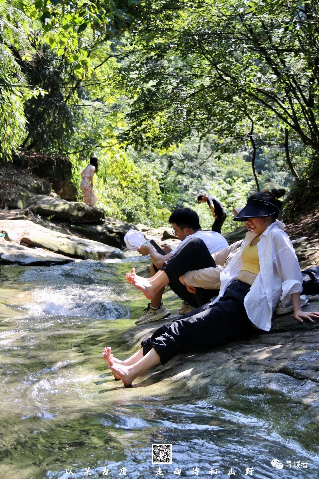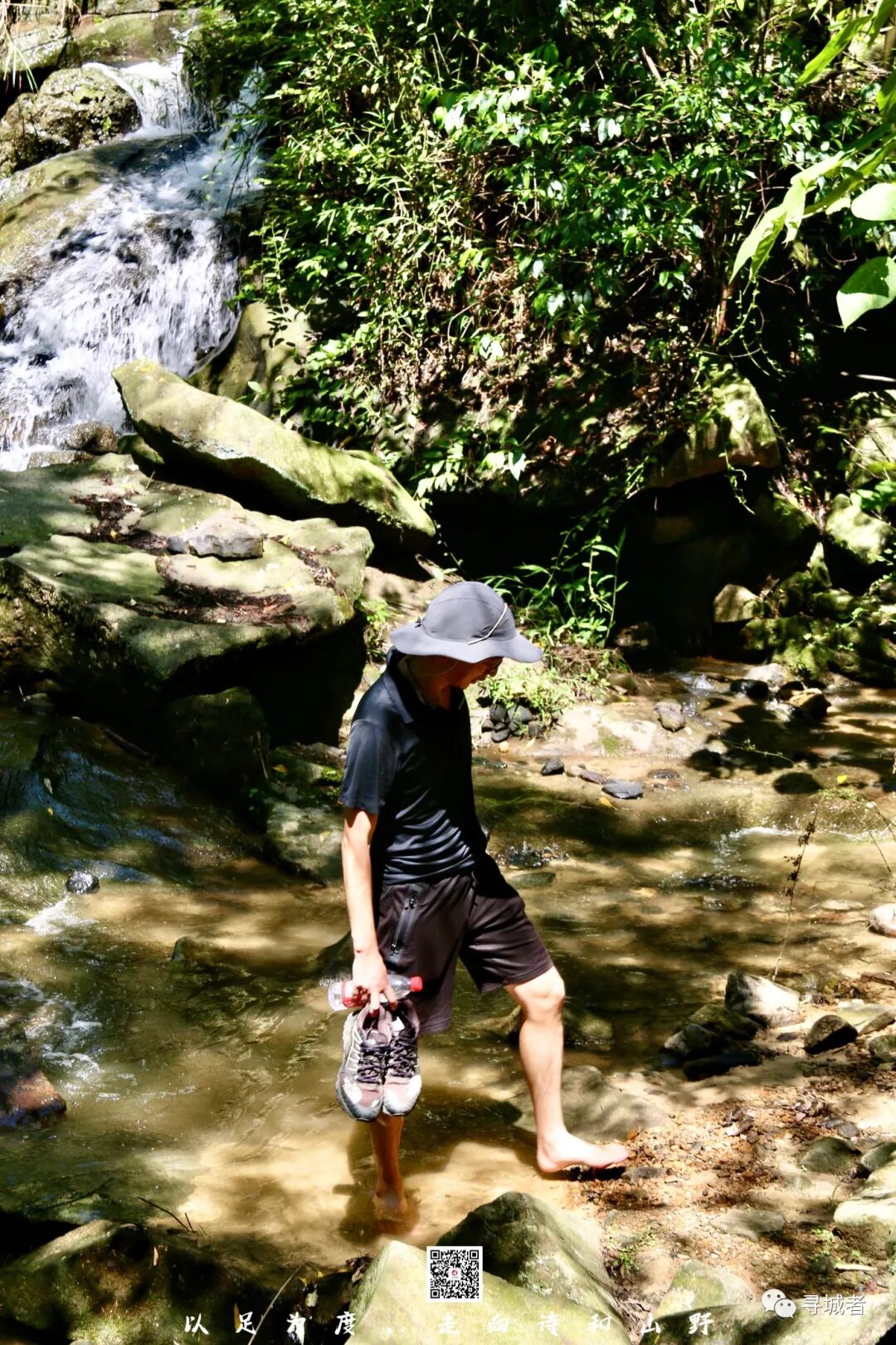 脱鞋赤脚踏入溪谷间戏水