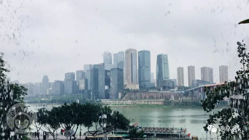 从出口的小道进入洪崖滴翠,透过水帘看江北城高楼林立。