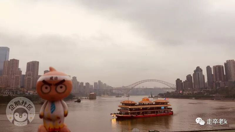 近处是洪崖洞民俗建筑仿古吊脚楼,远处是千厮门现代大桥飞架江上,找好角度拍过去也是很不错的。