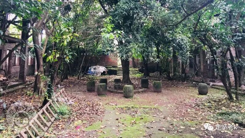 穿过寺庙前堂大厅,进入后院,满地枯枝败叶的地上几个圆柱体的石墩很是引人注意。抗战时期,翠云寺曾被开辟为女中部的校舍,曾经的议事大厅也成了女中部的操场,后来也演变成为翠云小学的校舍。