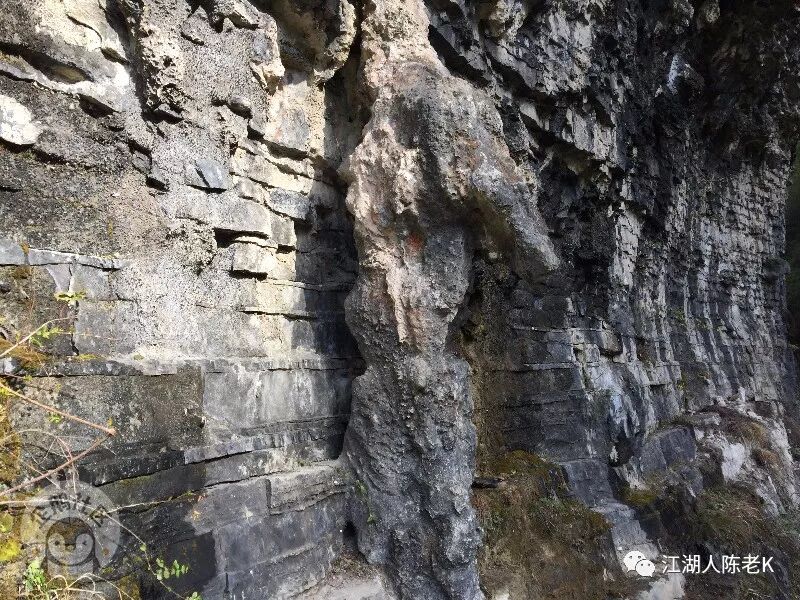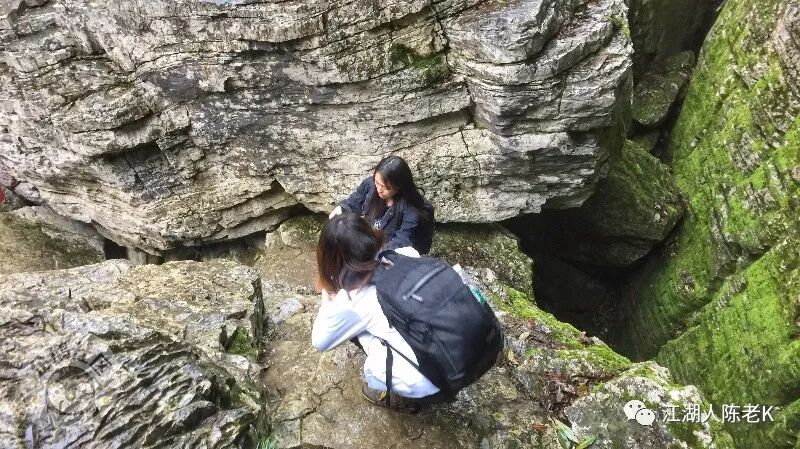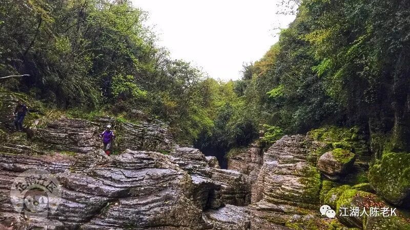 从山腰小道慢慢下到河谷底部,一片奇异的石床石壁跳入眼界,这便是清江古河床最精彩典型的巨石阵古峡谷河段。奈何山雨汇集,暗河涨水,原来干涸的河床道路已经淹没,所有前行的驴友开始翻山越岭野穿前行,清明节假,前来游玩的人过多,导致在这中冷门的线路中也堵车了,自此,开始了苦逼的探索之旅。