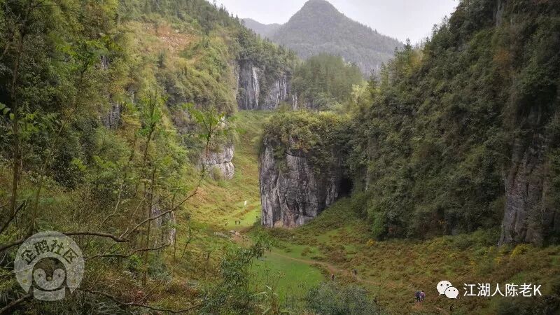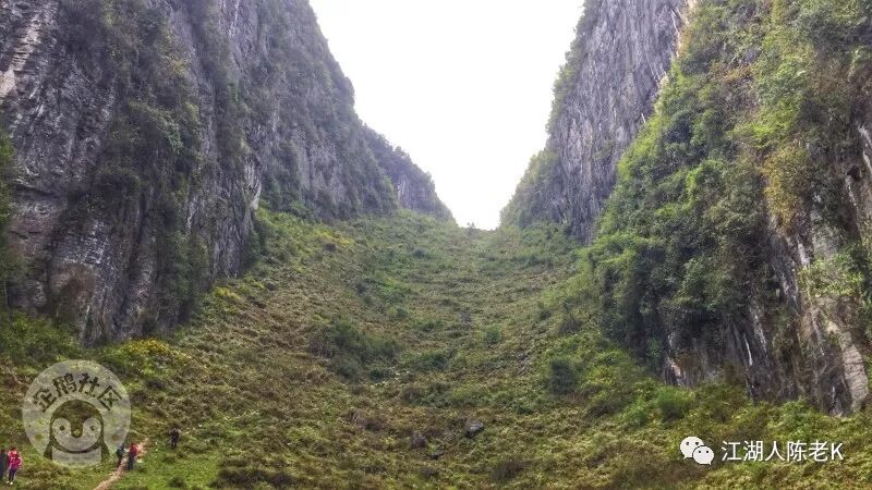回望二龙门的出口,中间是峡谷天坑草坪的奇妙风光与生动场景,据说是拍摄电影《聂隐娘》的取景地之一,有如仙境。
