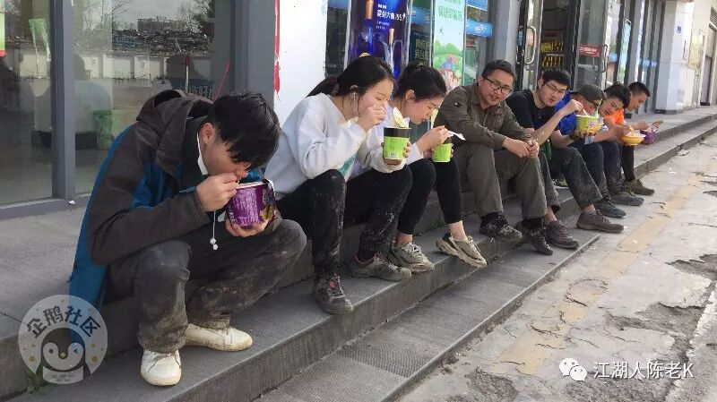 排排坐,吃果果。在泥泞道路上鏖战两个小时的小伙伴,在一处农家乐边上的简易长条凳上修整。