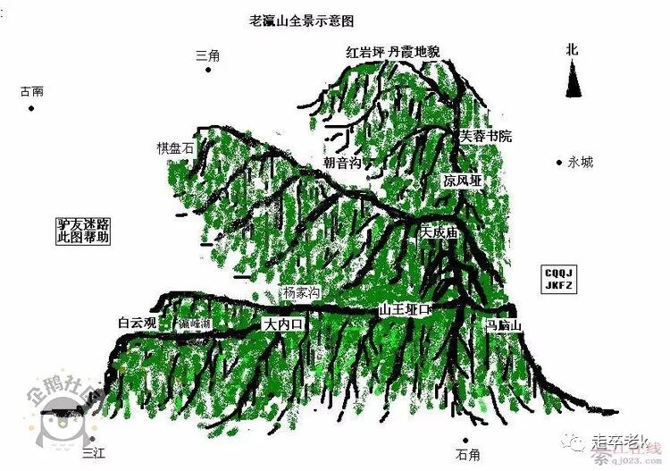 爪子形状的老瀛山各点分布图(网络图,侵删),传统路线基本上是从三江开始,循着左下山脊往上,经天成庙往右上山脊下潮音洞出谷。