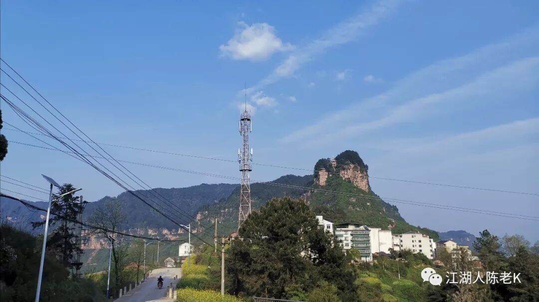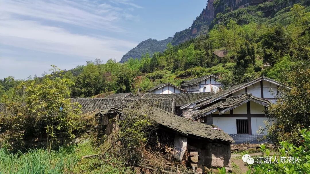 待到出得山谷,许多的泥瓦房院子掩映于林木之中,在老鹰山的映衬之下颇为美丽。
