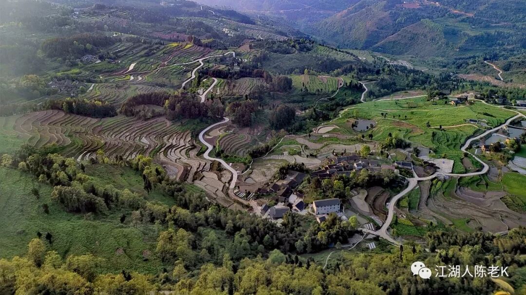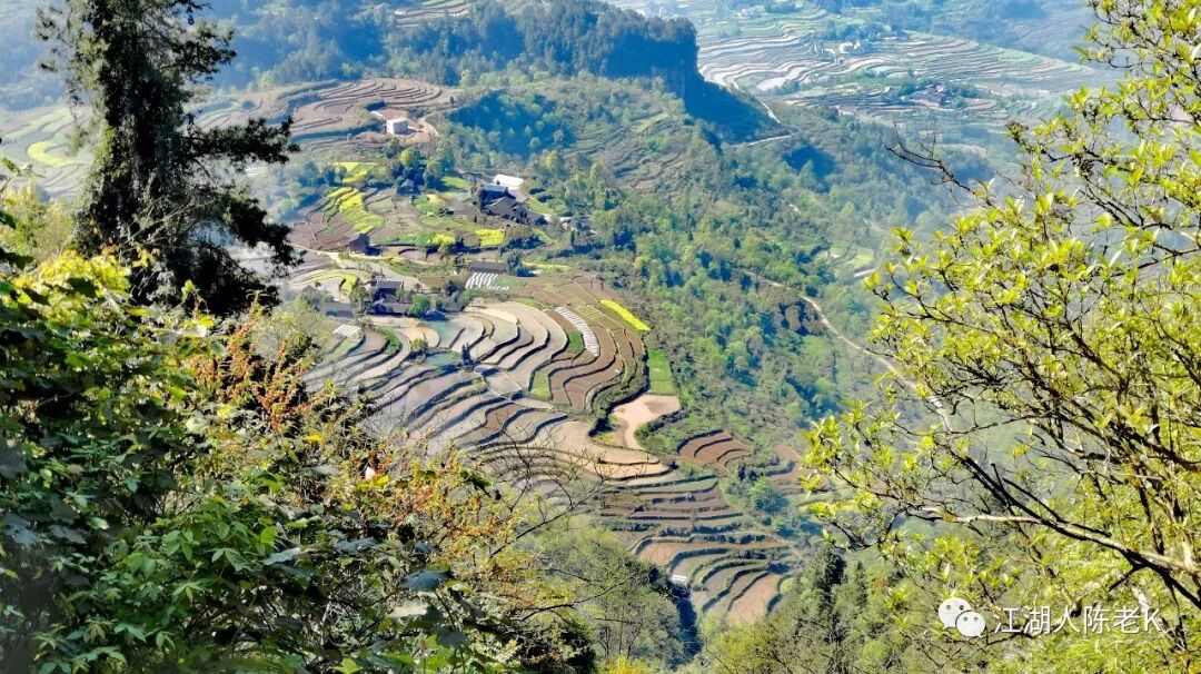 从红岩坪景区顺着公路前行,循着轨迹时不时的直下小路穿越丛林和村庄,穿过田野和梯田,向着山下的镇上行去。