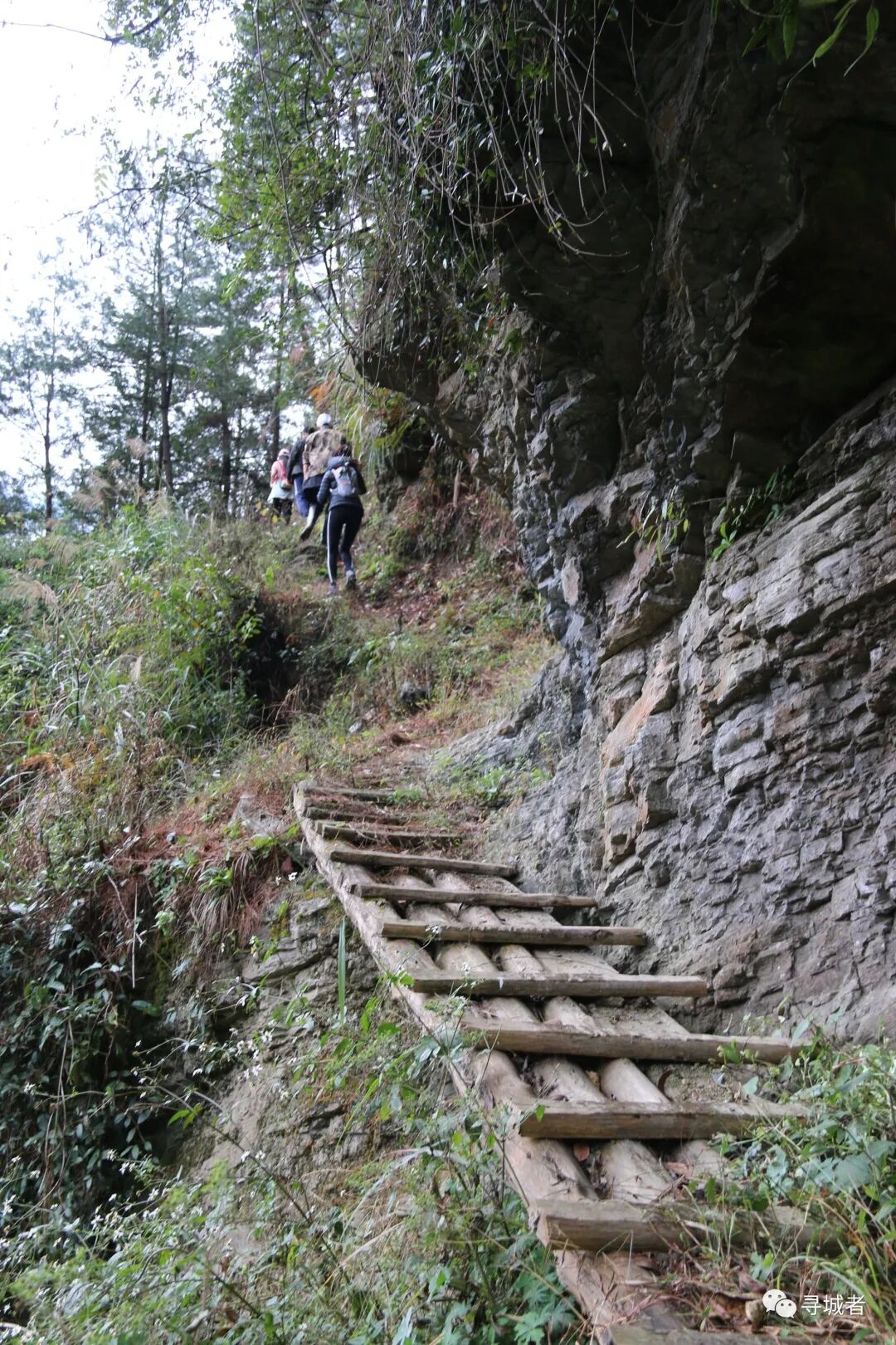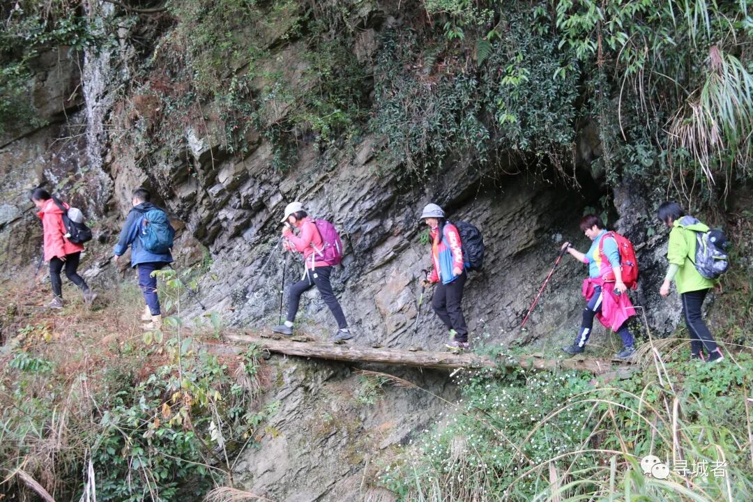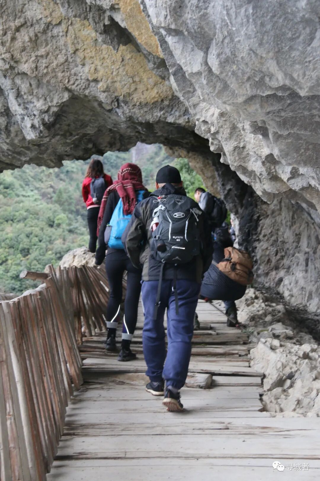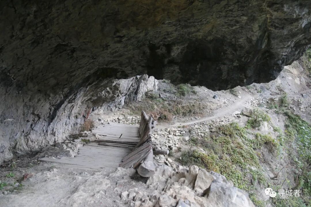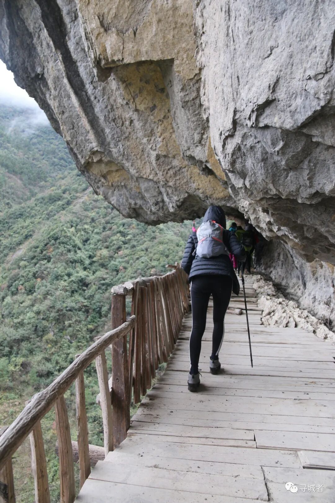 行走于半山崖壁小道之上,半个多小时的时间渐渐抵达一片凹陷的绝壁之上,一条十米左右的悬空栈道兀自凌崖绝壁之上。