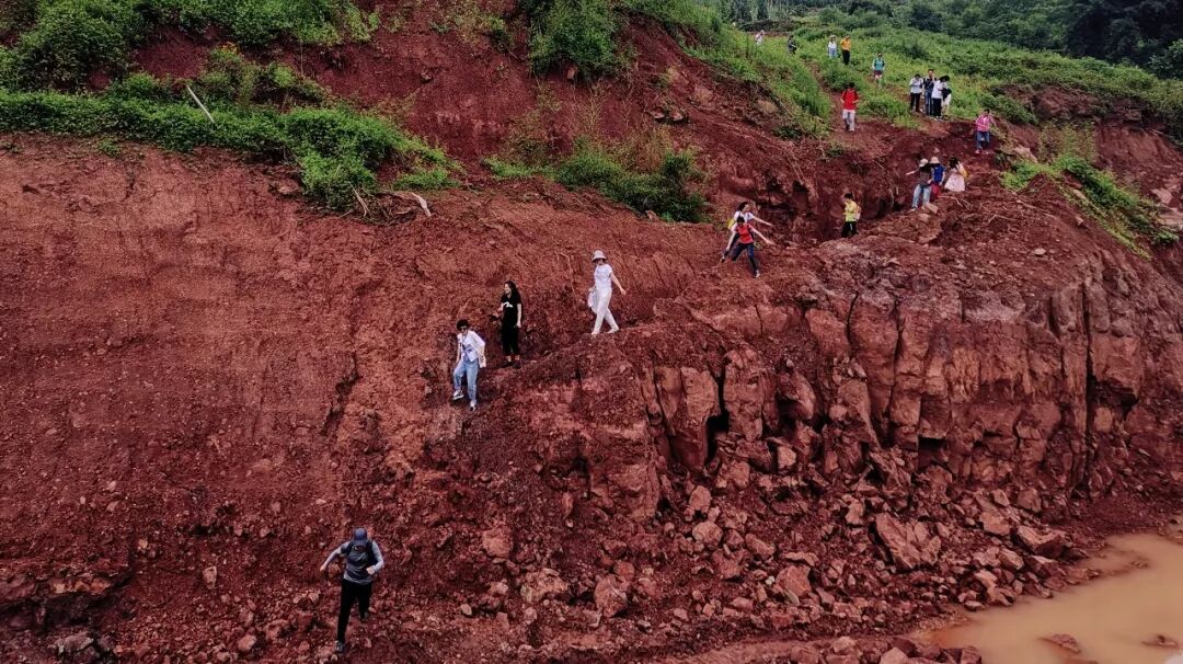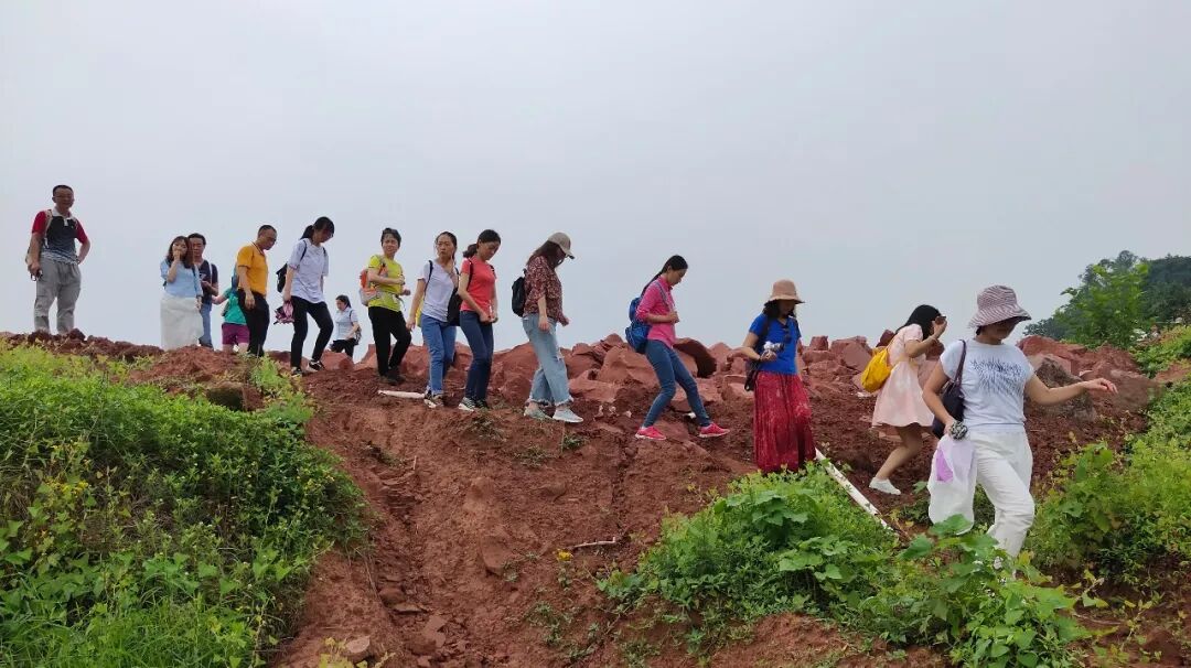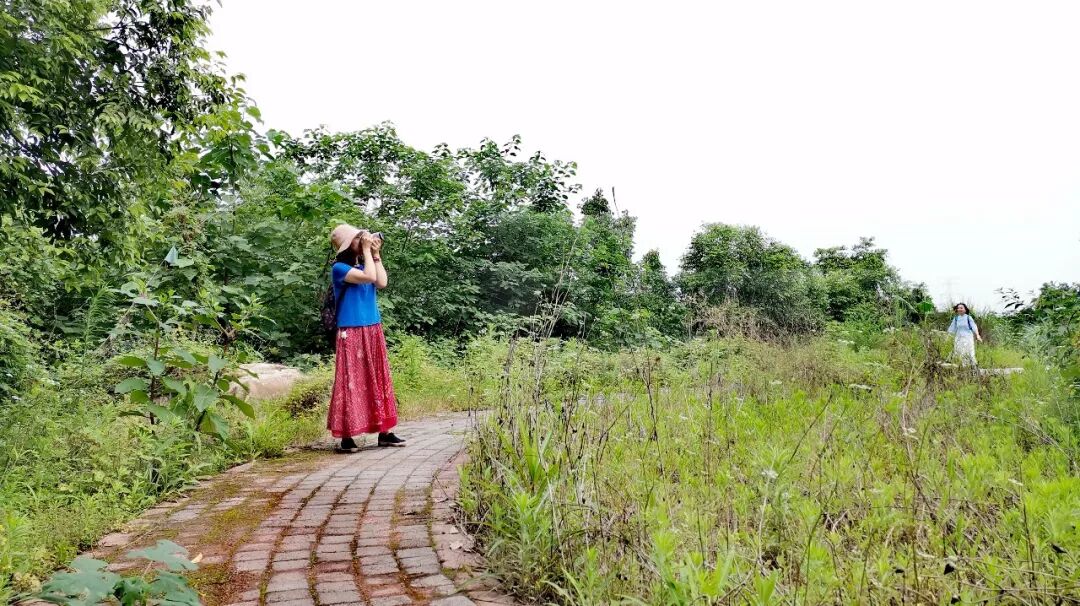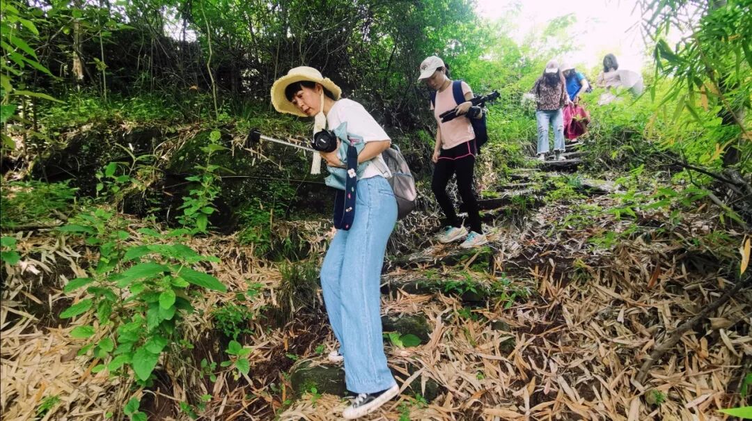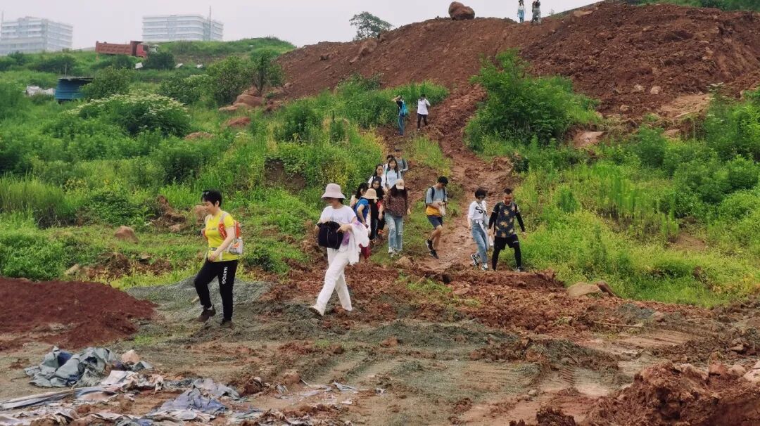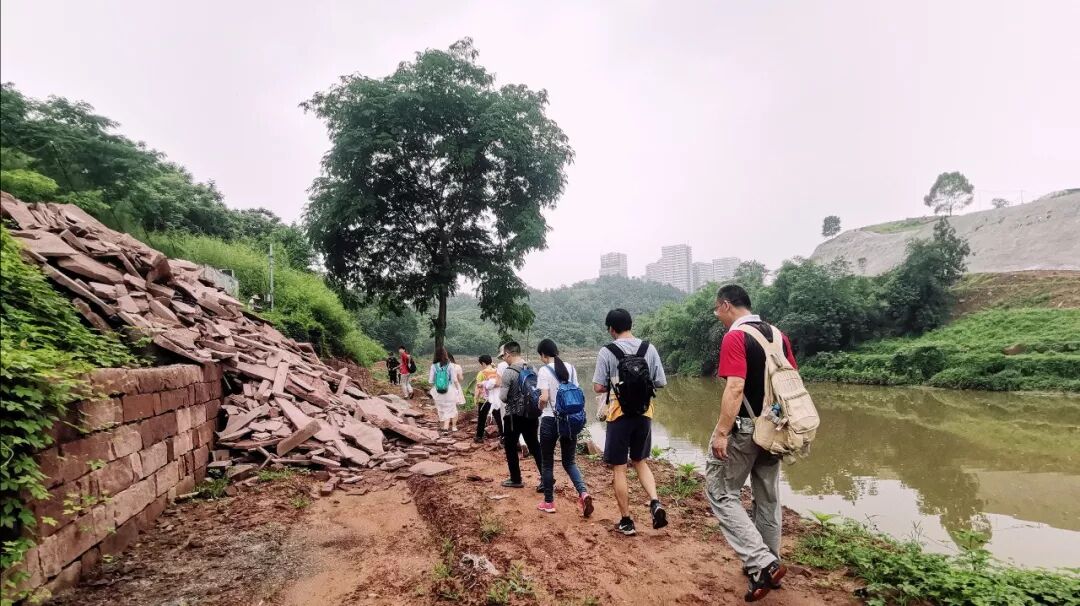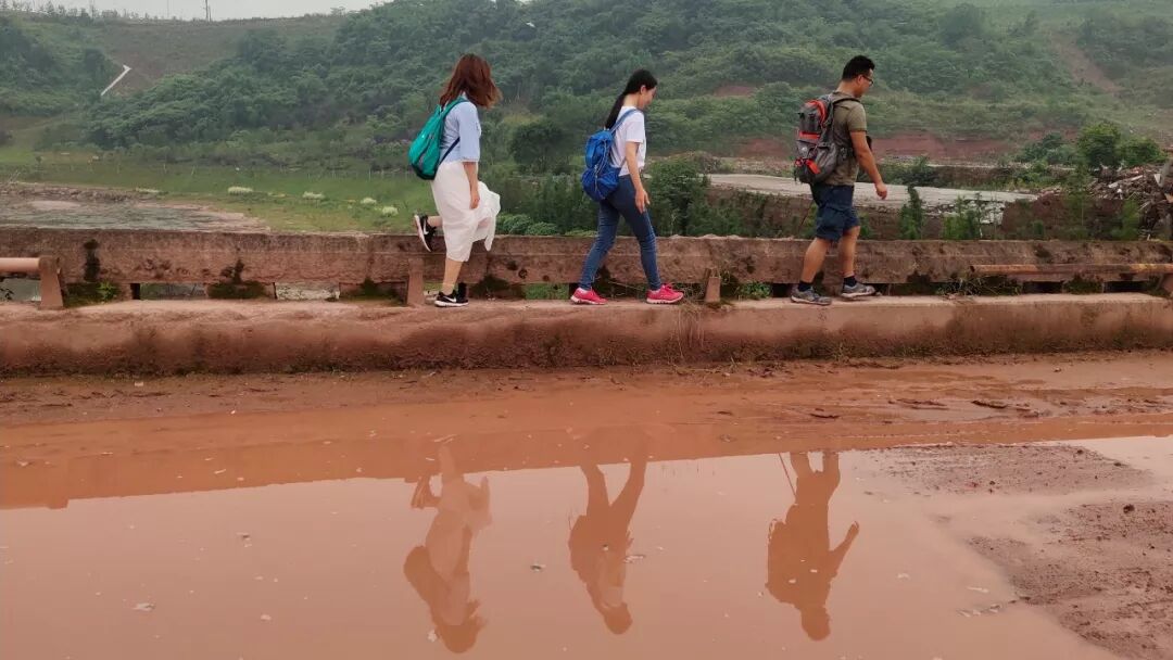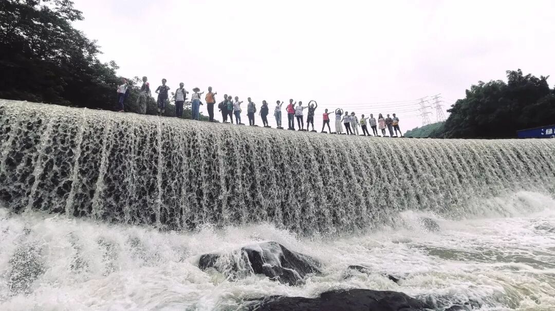 同行的小伙伴一路相互帮助,穿过修路的工地下到河边,抵达今天第一个打卡点。
