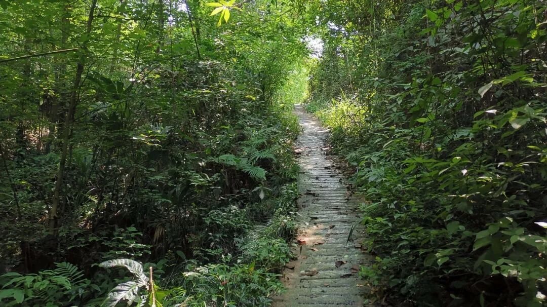 大约十五分钟,在蚊子的围攻中下至山底,阳光透过树梢照射在湿滑的小路之上,枯黄的树叶和嫩绿的地瓜藤很有些味道。