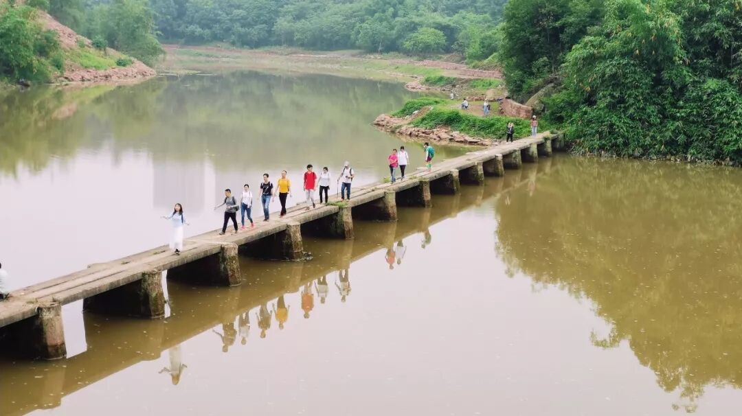 跳蹬桥,每一个石墩均为长方体,均高出水面之上,底部嵌入河床,长约四五十厘米,宽约二十厘米,间隔约20厘米,每个跳蹬桥由二十多个石墩组成。