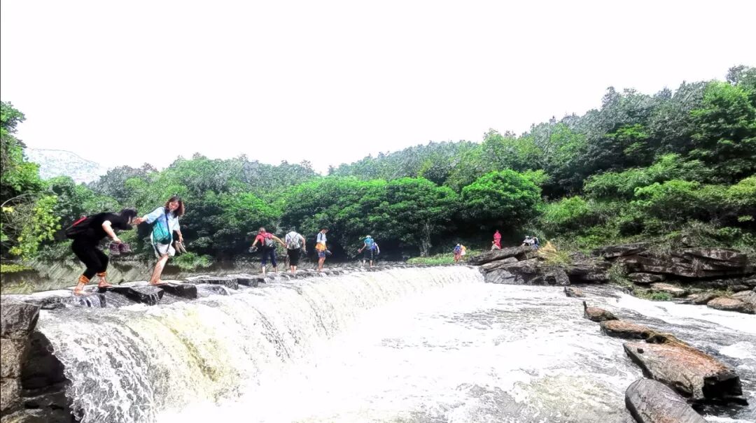从密林穿出,远远的就看到了一匹白布悬挂在后河之上,白色的水花和昏黄的河水形成鲜明的对比,略微丰沛的河水早已漫过跳石桥,于是乎大家踩水的表演开始了。