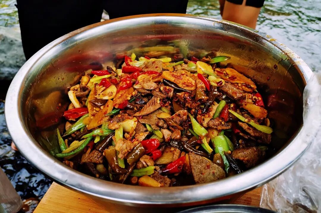 烧鸡公,选用生态农家放养的跑山鸡,新鲜宰杀即被送上厨房,精心配置的佐料,搭配鲜脆的嫩莴笋,时间和火候的转化让这锅烧鸡最终香气四溢。