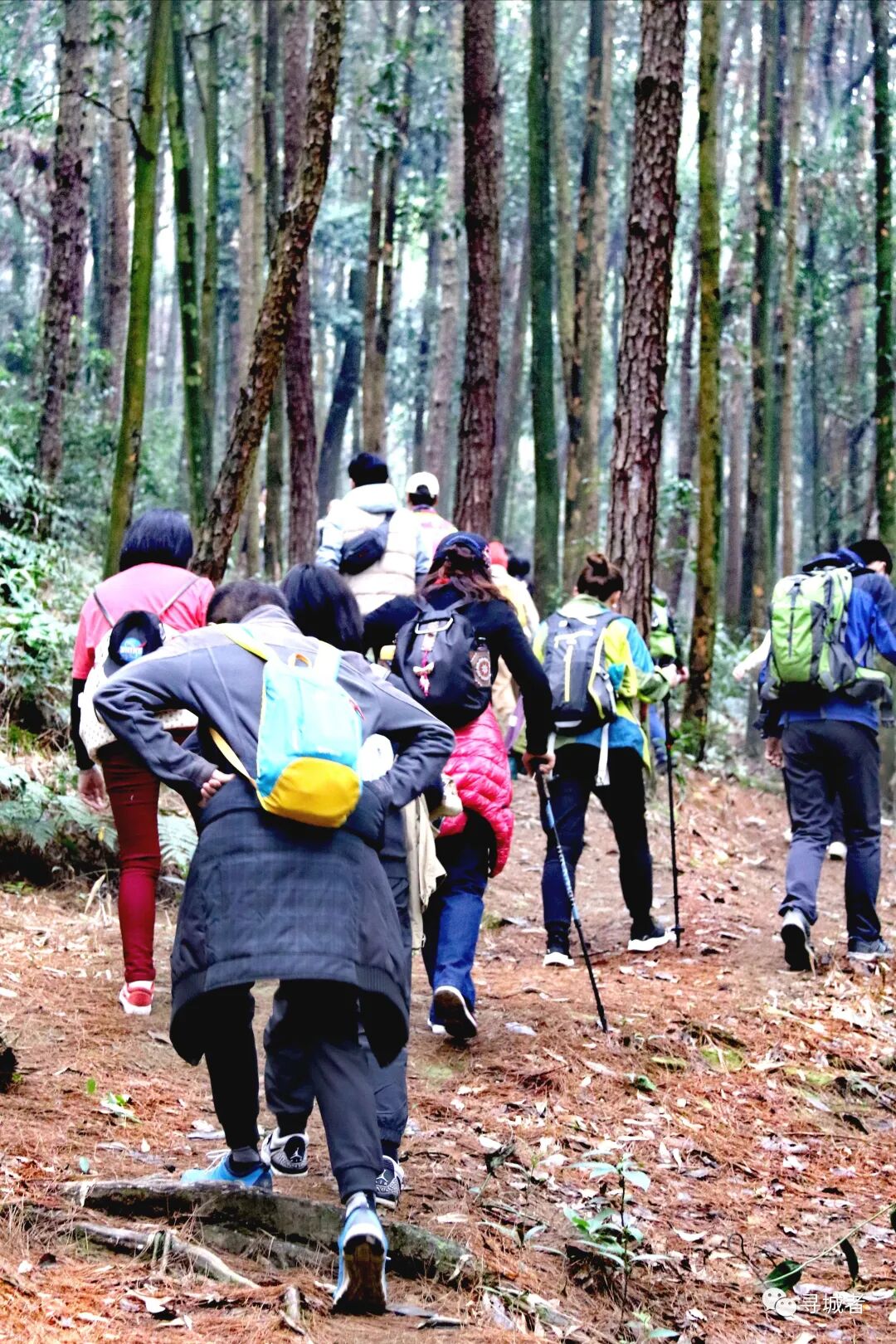 从农家穿小路速爬上山林边缘,钻过日渐枯萎的蕨根坡地,爬山的队伍渐渐散落于无垠的山野里。