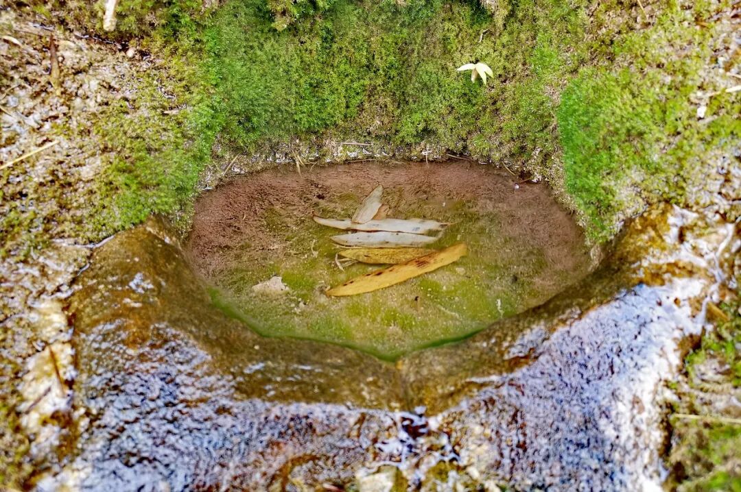 在许多古道的路上,类似这种蓄收浸水的水凼很多,经常有人打整的地方堪比泉水,甘甜可口,为往来的行人一解甘渴。