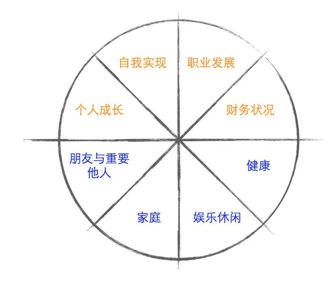 熟悉教练技术的同学,听过用过「生命平衡轮」。就是把生命作为一个整体的圆,均分成八等分,然后把影响你生命幸福感最重要的八个领域填入到扇形中,如图: