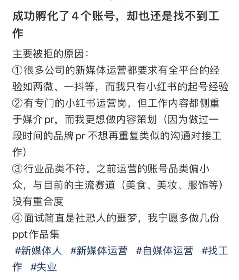 这两张图是小红书上一位创作者吐槽自己做了四个账号,却找不到工作。这是捧着金碗在要饭。小红书上用户付费能力和意愿都很强,稍微有点商业意识和产品化能力,每月收入2-3万没难度。