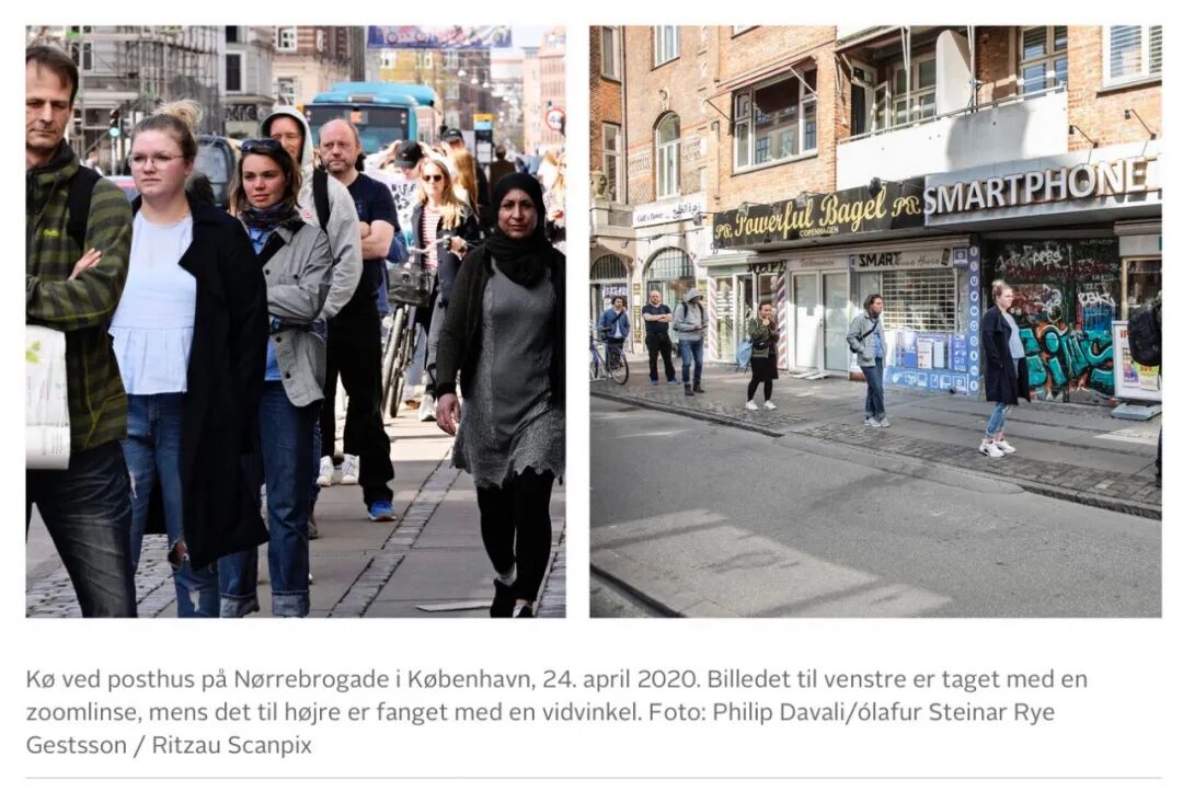 左边的望远镜头会拉近物体距离,让隔着 2 米排队的群众,看起来像不顾新冠病毒危险的蠢货,来恶意挑动读者情绪。
