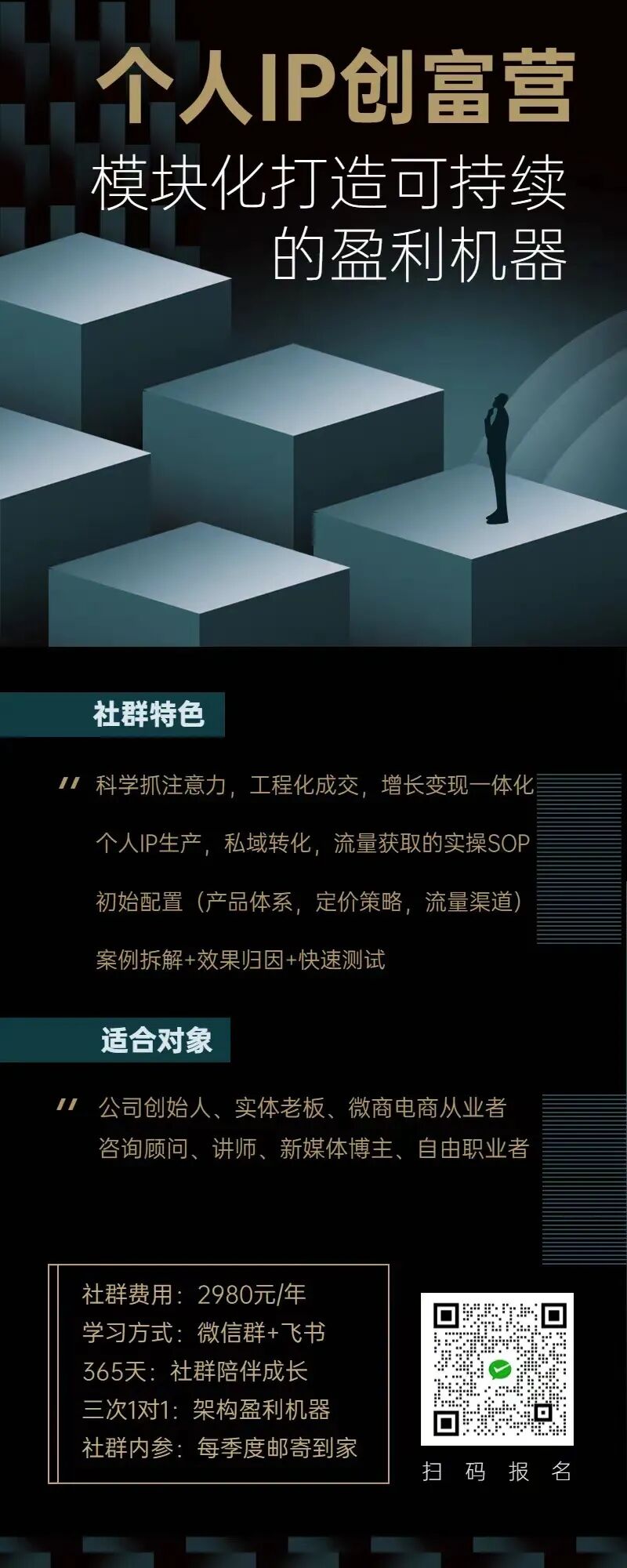 社群招收名额有限,随时涨价,欢迎扫码加入「个人IP创富营」。