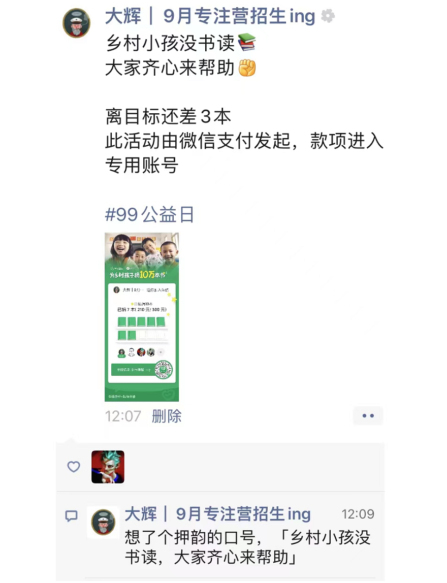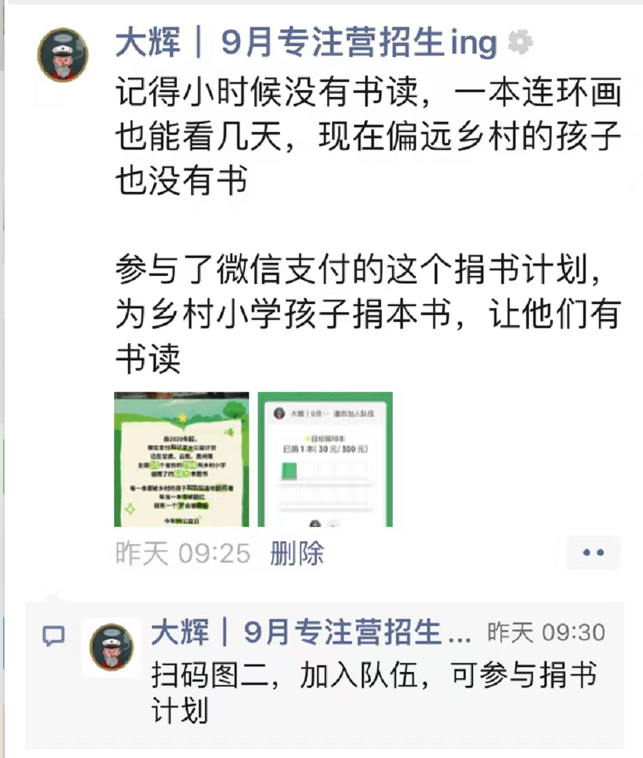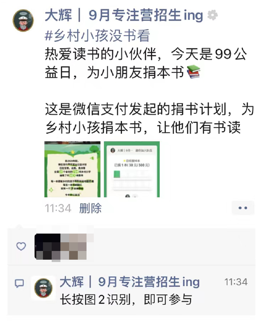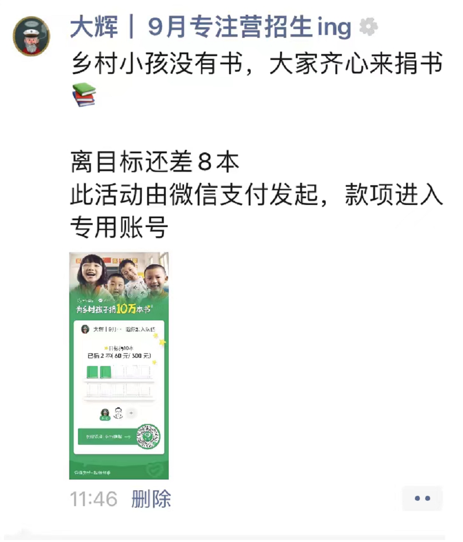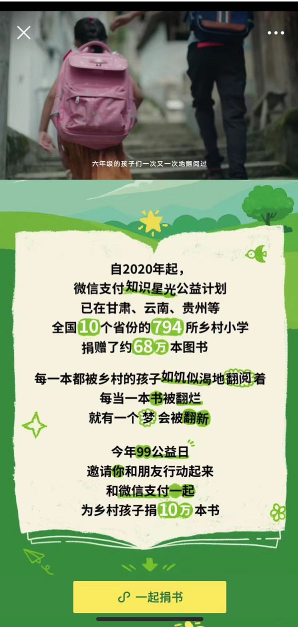 事情是这样的,昨天(9月8日),我在朋友圈看到微信支付发起的公益项目,这个项目是为乡村小孩捐书10万本。