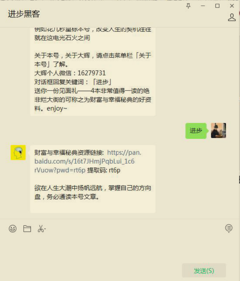 2022年5月份,我在公众号后台设置了关键词回复。关注后有一段文字提示,输入关键词「进步」,回复一个百度网盘链接,链接中有个文件夹,我放了四本电子书,有一本是《当下的力量》电子版。