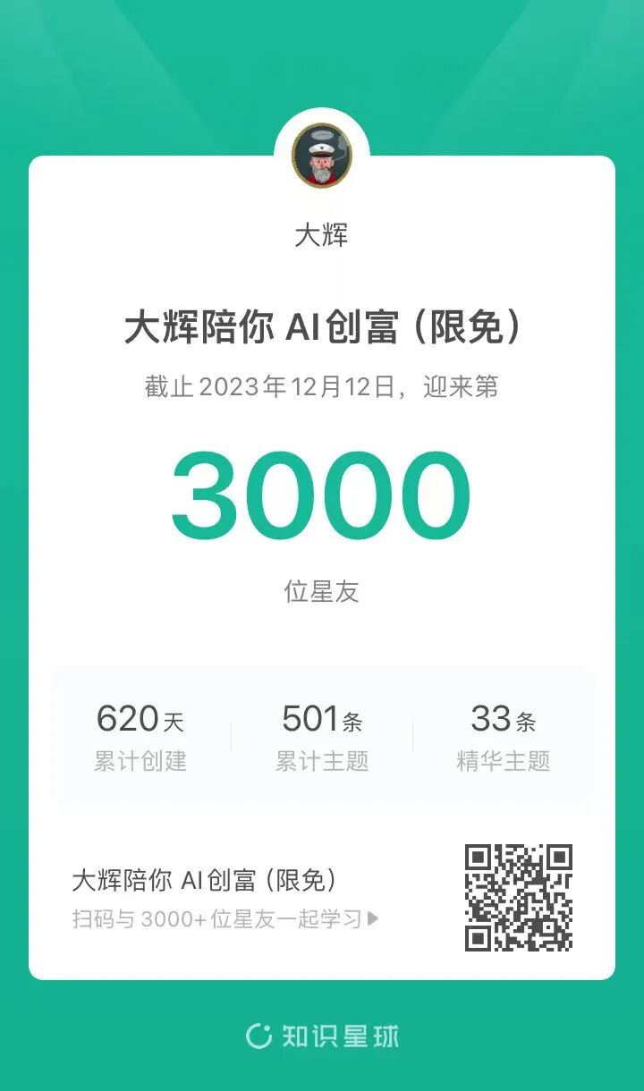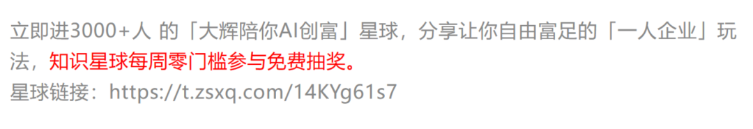 立即进3000+人 的「大辉陪你AI创富」星球,分享让你自由富足的「一人企业」玩法,知识星球每周零门槛参与免费抽奖。